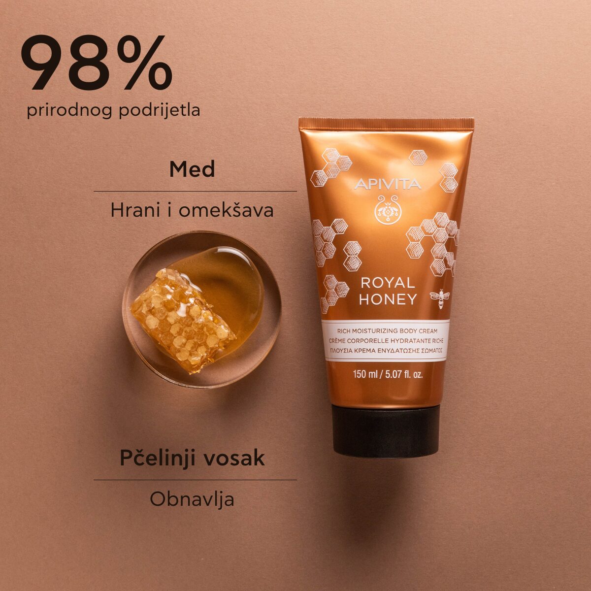 Apivita Royal Honey bogata krema za hidrataciju tijela s 98% prirodnih sastojaka dubinski njeguje i hidratizira kožu, vraćajući joj elastičnost, mekoću i prirodni sjaj. Inspirirana blagodatima meda od timijana, ova krema bogate i hranjive teksture idealna je za suhu, osjetljivu i dehidriranu kožu kojoj je potrebna posebna njega.