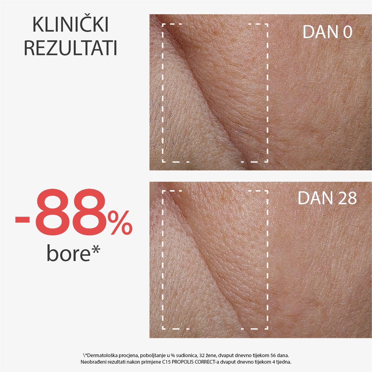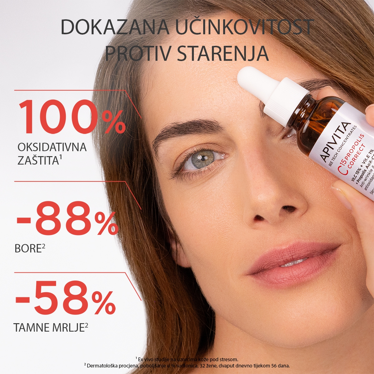 Osvježi i oživi umornu kožu uz Apivita serum za lice s trostrukim učinkom: stabilizirani vitamin C, vitamin E i patentirani antioksidativni propolis kompleks sinergijski djeluju kako bi koži vratili sjaj, blistavost i ujednačen ten. Redovitom upotrebom smanjuje vidljivost hiperpigmentacija, znakova umora i prvih znakova starenja.