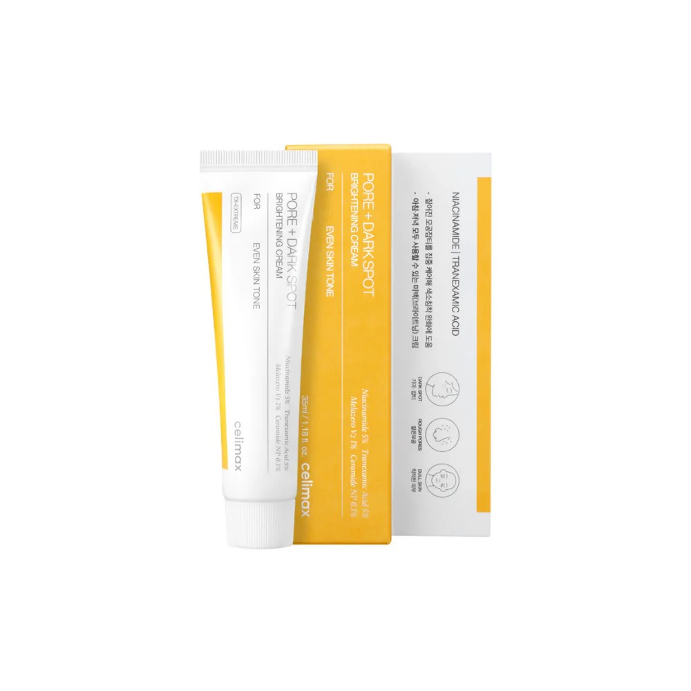 Celimax Pore+Dark Spot Brightening Cream je napredna tretmanska krema za ujednačavanje tena i smanjenje diskoloracija, formulirana s visokim koncentracijama aktivnih sastojaka za vidljive rezultate. Kombinacija 5% niacinamida, 5% traneksamične kiseline i patentiranog Melazero® kompleksa djeluje ciljano na tamne mrlje, melazmu i neujednačen ten, dok istovremeno poboljšava teksturu kože i smanjuje vidljivost pora.